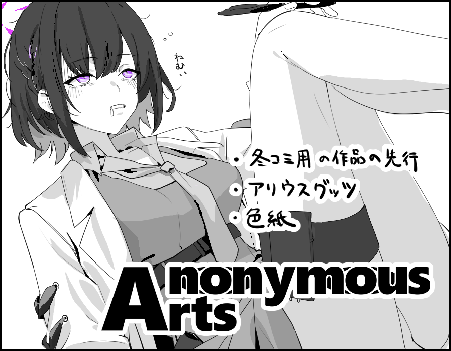 ![]() | 配置:アリウス08丁目 (ア08) サークル名:Anonymous Arts 代表者名:J. URL:https://x.com/J_anonymousarts |