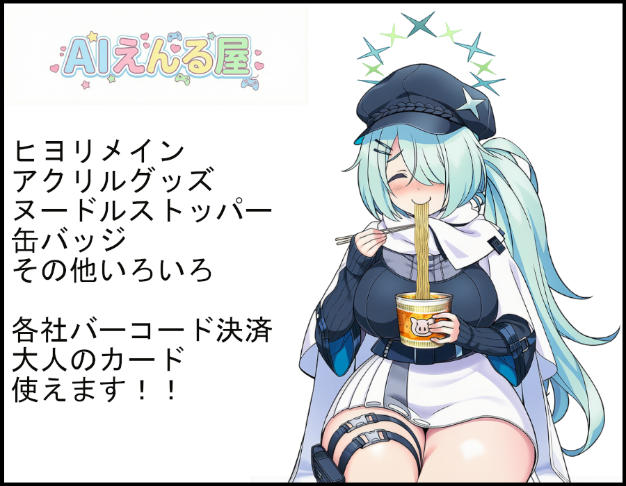 ![]() | 配置:アリウス09丁目 (ア09) サークル名:AIえんる屋 代表者名:羽鳥えんる URL:https://x.com/enru_ya |