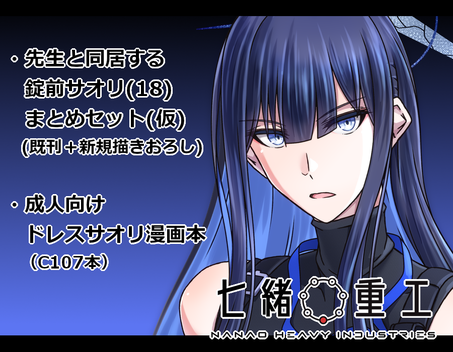 ![]() | 配置:アリウス11丁目 (ア11) サークル名:七緒重工 代表者名:御園ちあき URL:https://x.com/Misono_THIAKI |